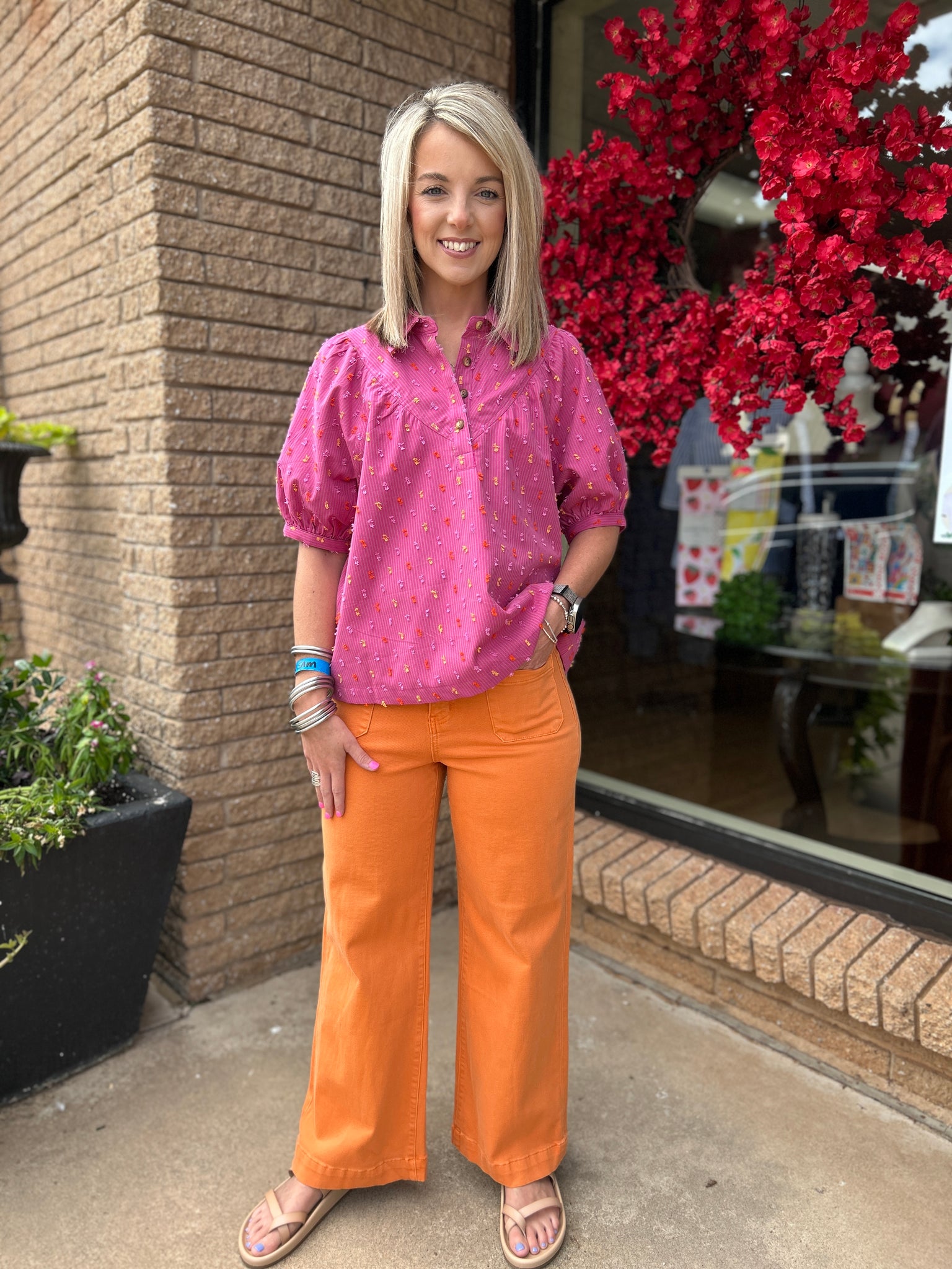 Bright, bold, and full of personality—this hot pink puff sleeve top is a standout piece! With tiny embroidered dots for texture and a flattering gathered neckline, it pairs perfectly with jeans or colorful wide-leg pants.